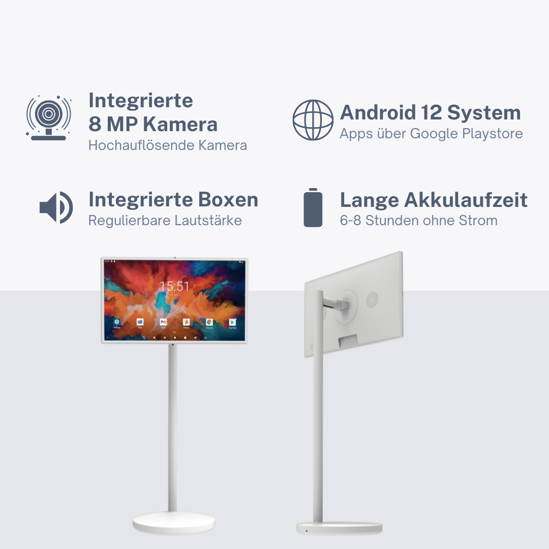 FlexiVision Pro bietet Ihnen eine umfassende Palette von Funktionen, einschliesslich eines verstellbaren Ständers, einer Whiteboard-Funktion und drahtloser Telefonprojektion. Dies macht das Produkt ideal für den Gebrauch zu Hause, in kleinen Büros oder für Werbezwecke. Die Flexibilität in der Bildschirmausrichtung und die drahtlose Konnektivität erweitern die Anwendungsmöglichkeiten erheblich.